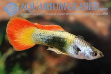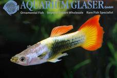 Ein echtes Farbwunder ist diese Guppyzuchtform aus Sri Lanka. Der Grundtyp ist Tuxedo, also vordere Körperhälfte hell, die hintere schwarz. Die Schwanzflosse entspricht dem Sunrise (= Sonnenaufgang)-Typ, also am Ansatz gelb und nach außen hin rot werdend, wobei bei jedem Individuum die Sonne unterschiedlich weit aufgegangen ist. Über dem Körper liegt als Deckfarbe ein Metallic, das, je nach Lichteinfall, grün bis blau schimmert.