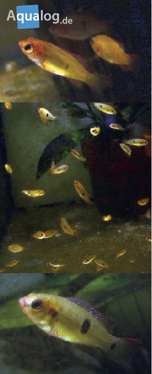 The moment of truth came when the “Fire Lips” young lost their infant stripes. Almost all of them developed a perfectly normal Hemichromis guttatus spot! Only eight out of the 134 juveniles that I raised exhibited a greatly reduced lateral spot or none at all. So it can be stated with a high degree of certainty that Hemichromis sp. “Fire Lips” is a selectively cultivated form of Hemichromis guttatus. The question remains as to whether the lateral spot will disappear in all individuals later on (at the time of writing the young are just eight weeks old). We will wait with bated breath…….